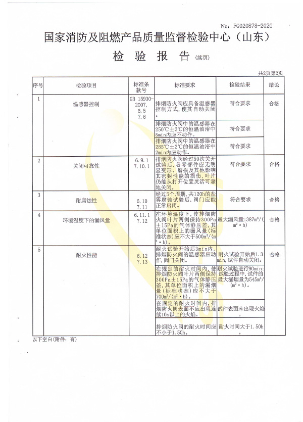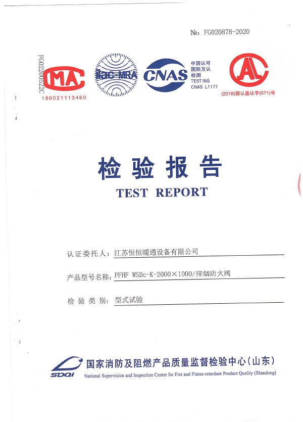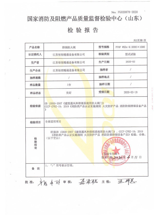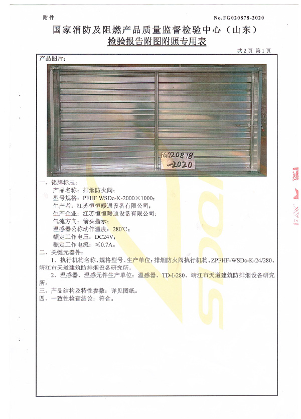 排煙防火閥認證證書2000X1000